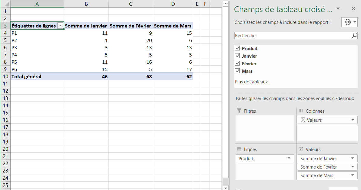 Nous avons fait glisser successivement les champs Janvier, Février et Mars dans la zone Valeurs. C’est long, glisser 1 seul champ aurait été plus rapide ! Quand nous aurons les autres mois de l’année, nous devrons ajouter 9 autres champs. C’est long également ! Et on peut se tromper lors de l’ajout. Calculer le total de l’année va être compliqué. Possible, mais compliqué ! Bonne structure