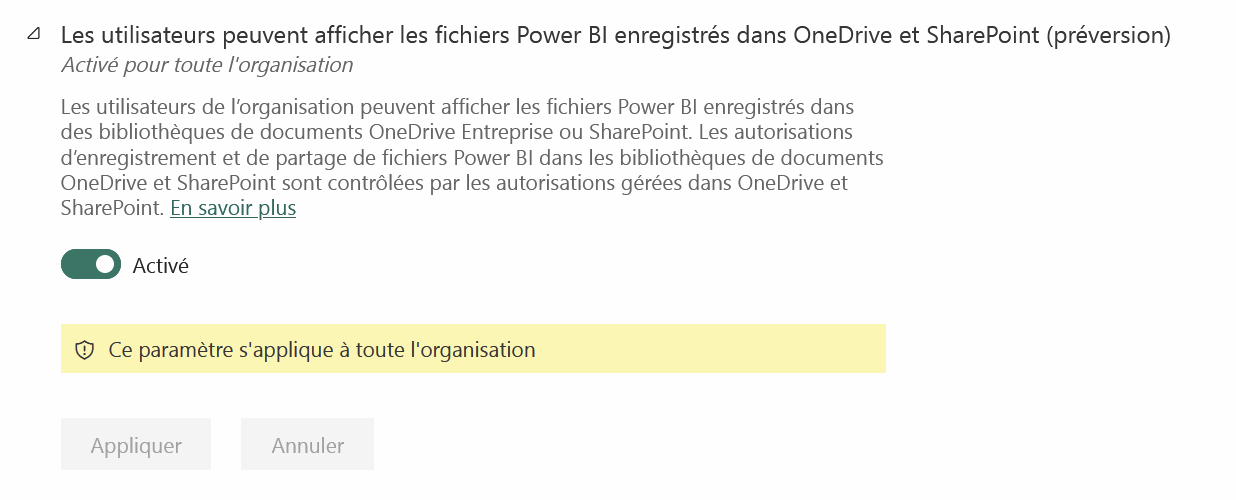 Accédez au de votre organisation Power BI et recherchez les paramètres liés à OneDrive ou SharePoint. Activez l'option Les utilisateurs peuvent afficher les fichiers Power BI enregistrés dans OneDrive et SharePoint. Ce paramètre est nécessaire pour ouvrir le fichier dans la visionneuse web après l'avoir enregistré. Votre organisation peut l'avoir désactivé :