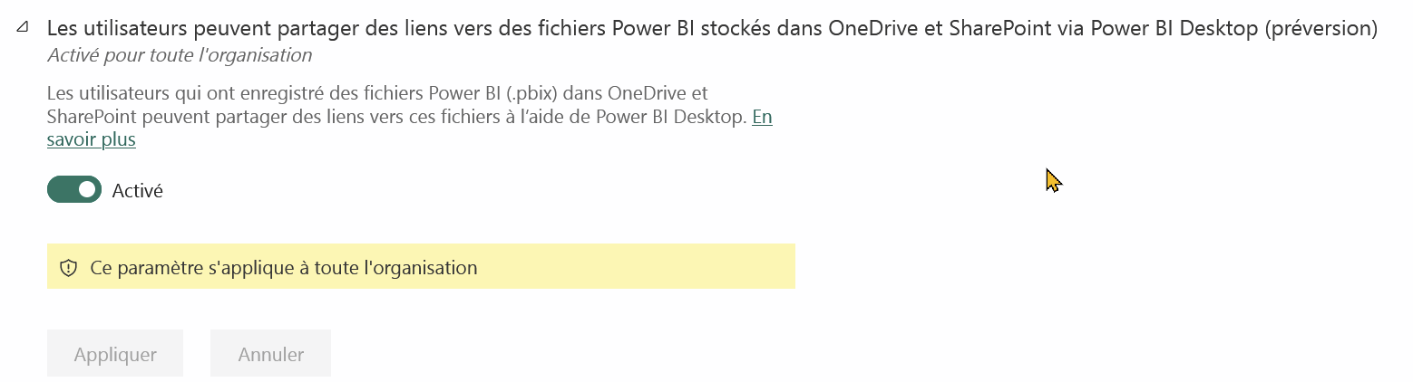Activez l'option Les utilisateurs peuvent partager des liens vers les fichiers Power BI stockés dans OneDrive et SharePoint via Power BI Desktop. Ce paramètre est nécessaire pour que l'option de partage soit disponible dans Power BI Desktop après l'enregistrement :